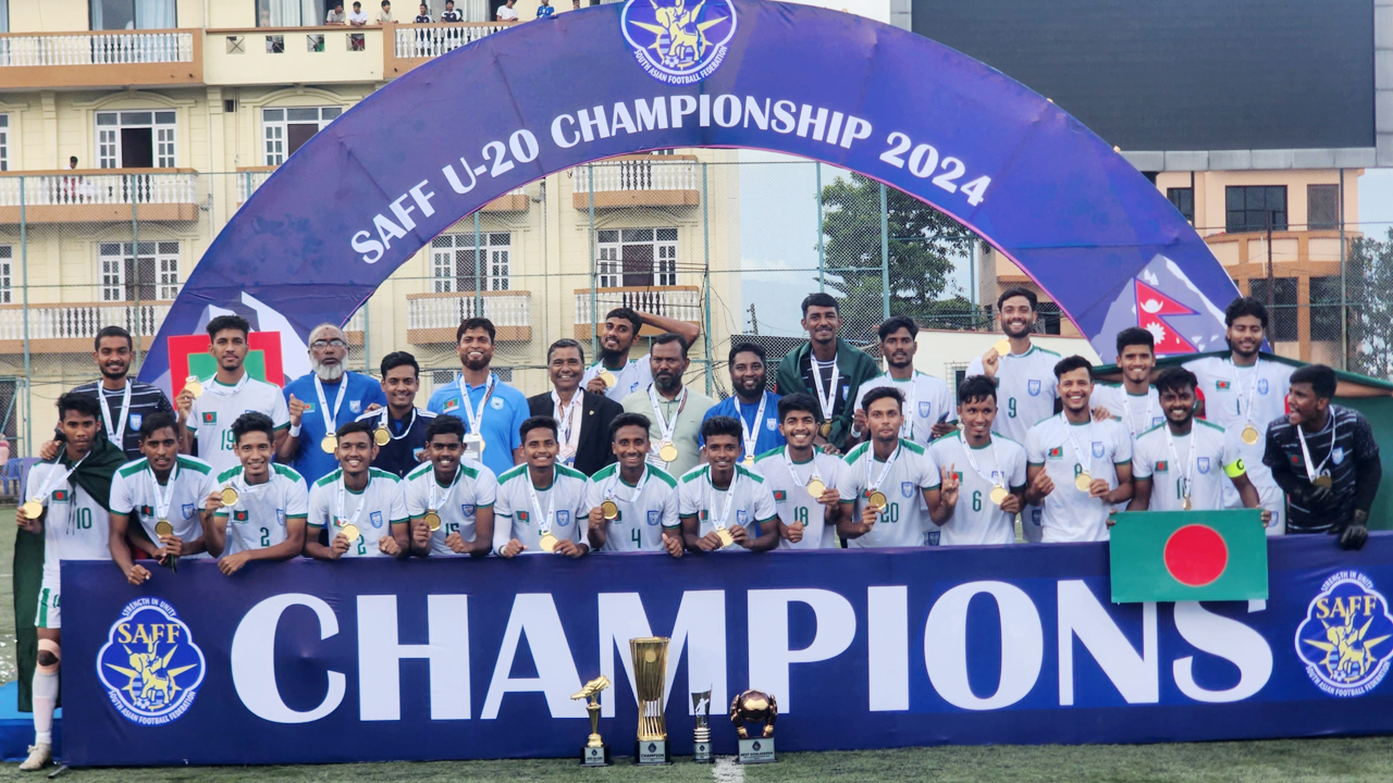বিশেষ সংবাদদাতা:নেপালের বিপক্ষে প্রথম জয়, গ্রুপপর্বে হারের প্রতিশোধ এবং প্রথমবারের মতো সাফ অনূর্ধ্ব-২০ চ্যাম্পিয়নশিপের শিরোপা। বাংলাদেশ যেন ‘এক ঢিলে তিন