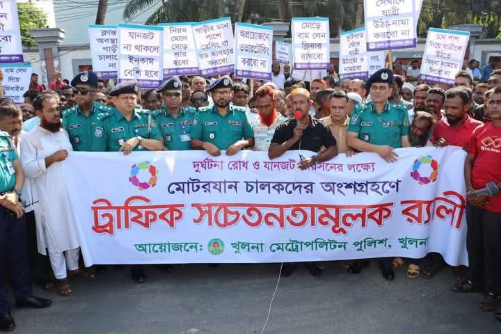 খুলনায় দুর্ঘটনা রোধ ও যানজট নিরসনের লক্ষ্যে কেএমপি’র ট্রাফিক সচেতনতামূলক র্যালি.